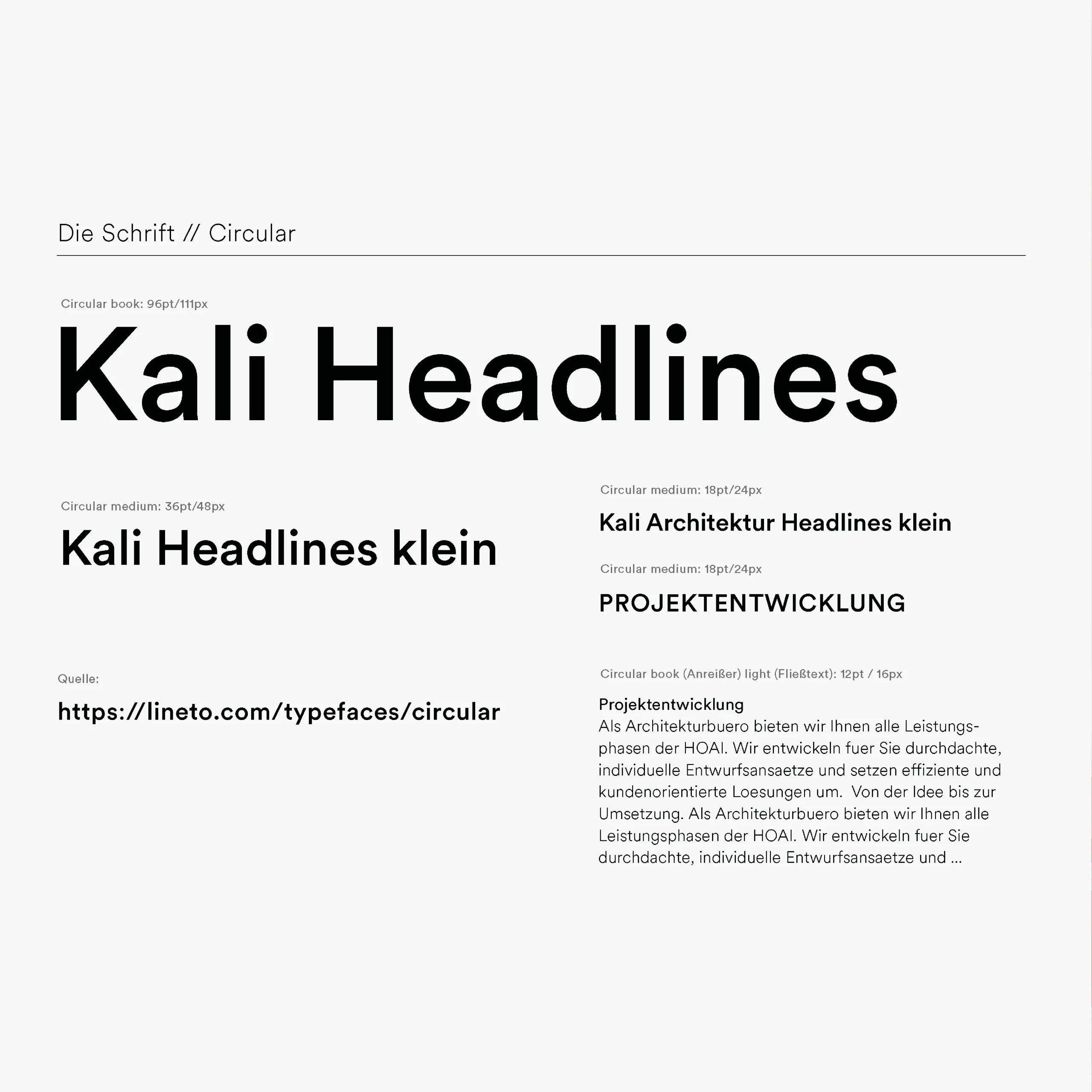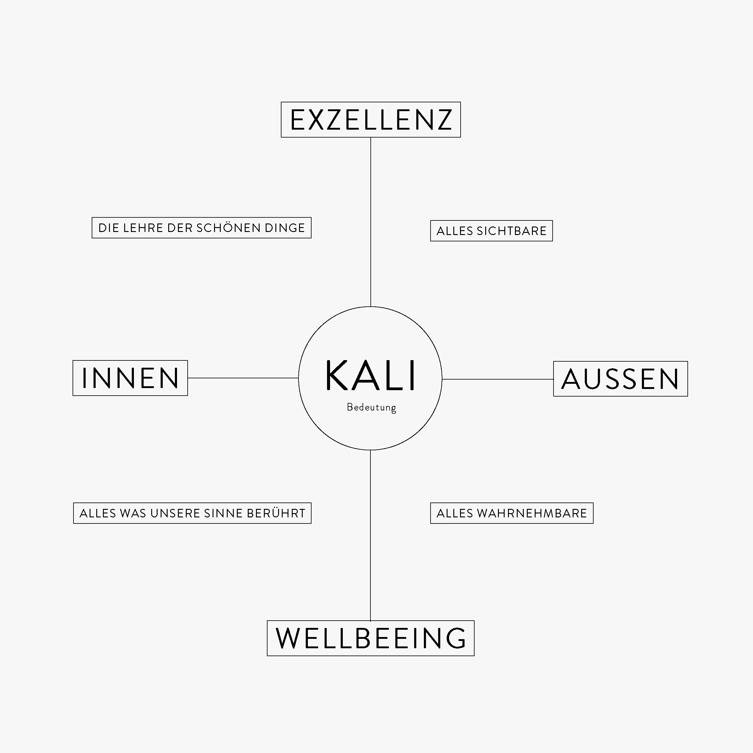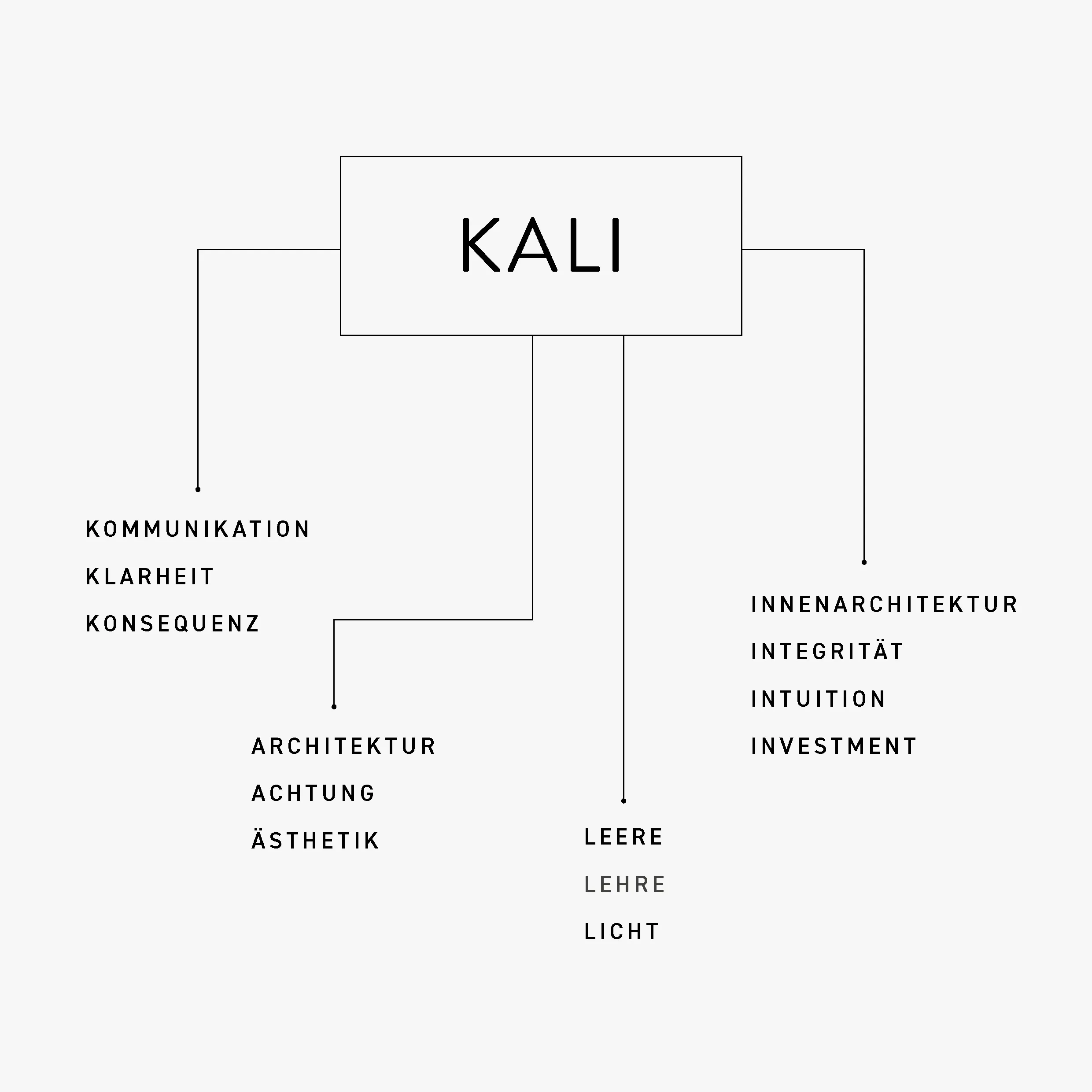 Entwicklung des Logos und Definition der typografischen Grundlage für Kali, ein Architektur- und Innenarchitekturbüro. Ausgangspunkt war die Kallistik, die Lehre von den schönen Dingen. Schönheit wird hier umfassend verstanden. Innen und Außen, Sichtbares und Wahrnehmbares, Exzellenz und Wellbeing. Das Branding übersetzt diesen Anspruch in eine reduzierte, proportionierte Form. Die gewählte Schrift unterstützt diese architektonische Denkweise. Präzise, ruhig, zeitlos. Ein visuelles System, das Struktur schafft und gleichzeitig Raum lässt.